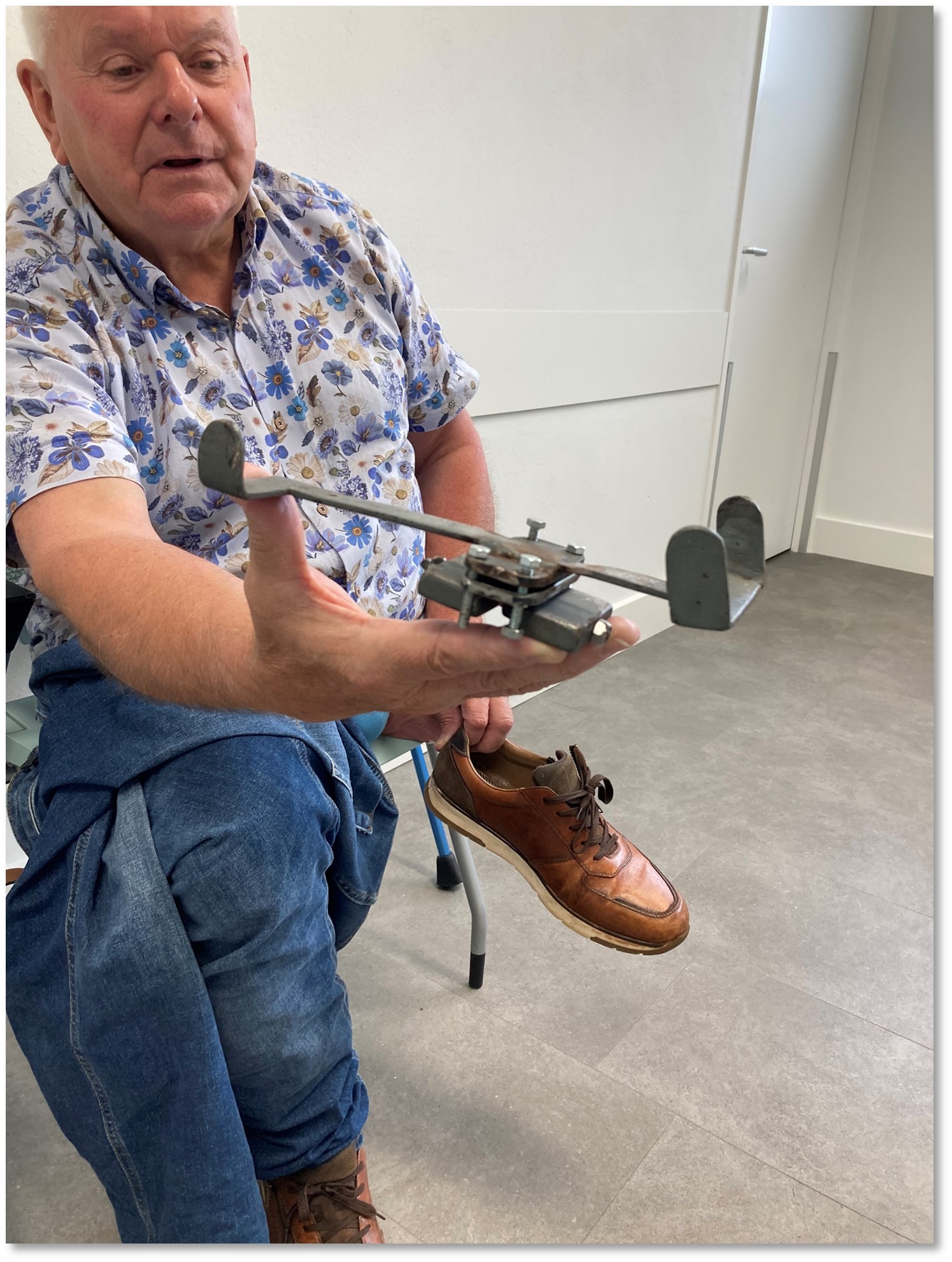 “En ik wilde ook graag blijven fietsen”, zegt Harry. “Daarom heb ik zelf een speciale beugel gemaakt om de voet van de prothese vast te klikken op het pedaal”, Harry laat trots de beugel zien. “Ik heb deze ook voor anderen gemaakt, dat doe ik nu niet meer, maar ze mogen me altijd bellen voor uitleg en tips”, lacht Harry. “Helaas behoort het fietsen voor mij tot de verleden tijd”, vervolgt Harry. “Ik heb een zwaar hartinfarct gehad en de cardioloog raadde me af om weer op de fiets te stappen, dus ben ik overgestapt naar wandelen. Ook met een prothese is er heel veel wat ik wel kan en Sjoerd denkt daarin met me mee. Ik wil echt nooit meer een andere adviseur.”