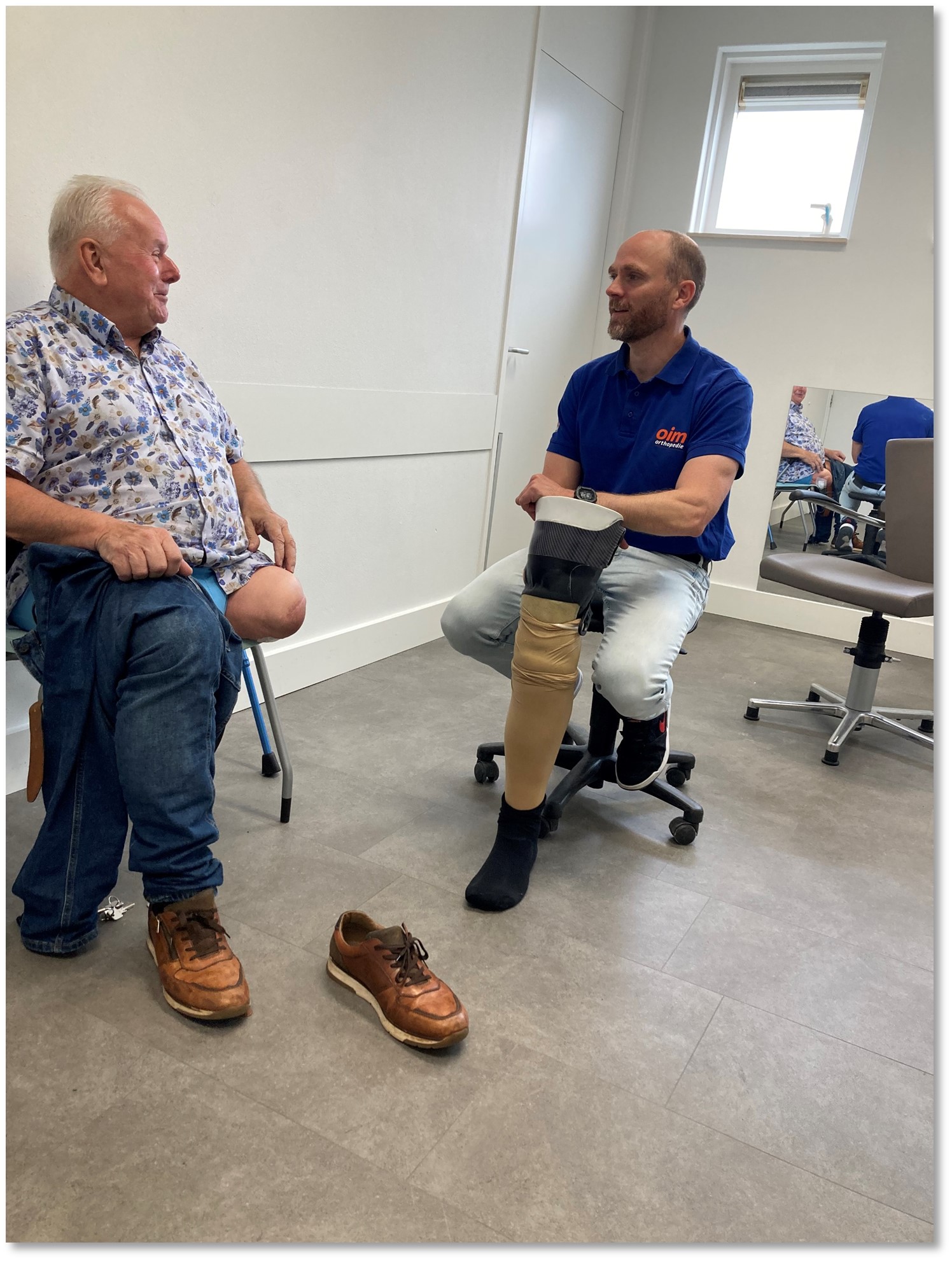 Doordat hij een hele kort stomp heeft, is het lopen met een prothese een flinke uitdaging. Daar komt bij dat Harry’s huid snel kapot gaat en dan infecteert. “Met mijn eerste prothesemaker kwam ik daar niet uit”, vertelt Harry. “Via een kennis van de revalidatie, kwam ik met OIM en Sjoerd Verwaaijen in contact. Sjoerd is met mij op zoek gegaan naar een koker die wél goed zat. En dat is gelukt. Sinds hij mijn orthopedisch adviseur is, heb ik nooit meer last dat mijn huid kapot gaat. Eerder moest ik me regelmatig een dag of drie met de rolstoel voortbewegen omdat ik de prothese niet kon dragen. Nu draag ik de prothese elke dag en doe hem pas ’s avonds rond een uur of 10 af. Sjoerd heeft wat mij betreft gouden handen, is flexibel en heeft altijd tijd voor mij.”